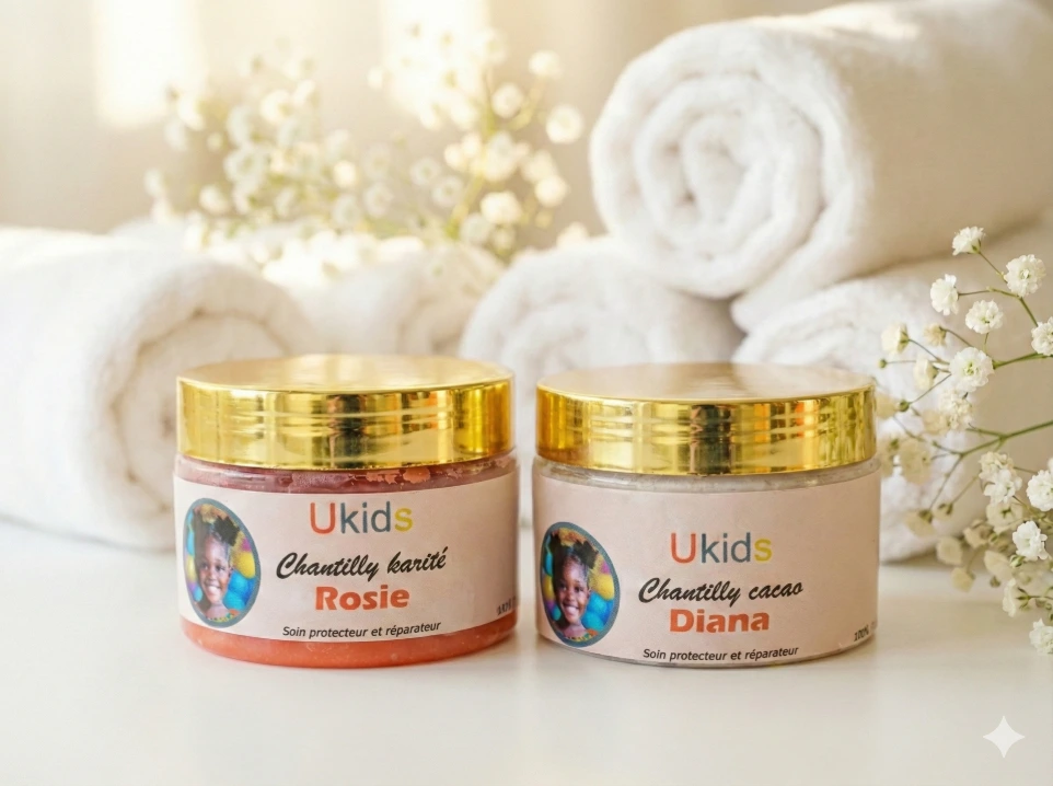 Les chantilly capillaires ROSIE et DIANA sont des soins nourrissants à base de beurres purs et non raffinés karité pour ROSIE et cacao pour DIANA enrichis d’huiles bio et essentielles. Leur texture onctueuse et crémeuse pénètre facilement le cuir chevelu pour offrir un véritable soin protecteur et réparateur. Idéal pour chouchouter nos petites princesses avec douceur et efficacité.